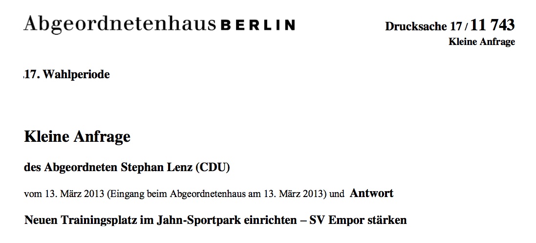 Der Friedrich-Ludwig-Jahn-Sportpark ist die zentrale Sportstätte am Prenzlauer Berg. Im Rahmen einer Sanierung sollte deshalb auch die Möglichkeit der Errichtung eines weiteren Kunstrasenplatzes genutzt werden. Den aktuellen Planungsstand habe ich erfragt.