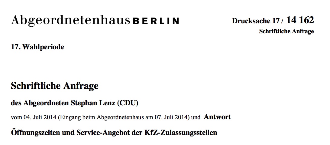 In einer Schriftlichen Anfrage habe ich mich über die aktuelle Situation der Berliner KfZ-Zulassungsstellen informiert. Dabei ging es u.a. um die Möglichkeit für kurzfristige Zulassungsverfahren.