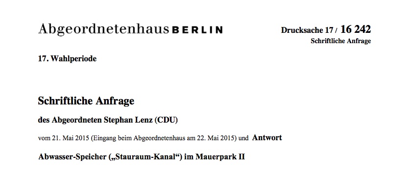 Anhand einer schriftlichen Anfrage erkundigte ich mich bei dem Senat zum aktuellen Sachstand bezüglich des Abwasser-Speichers ("Stauraum-Kanal") im Mauerpark II.