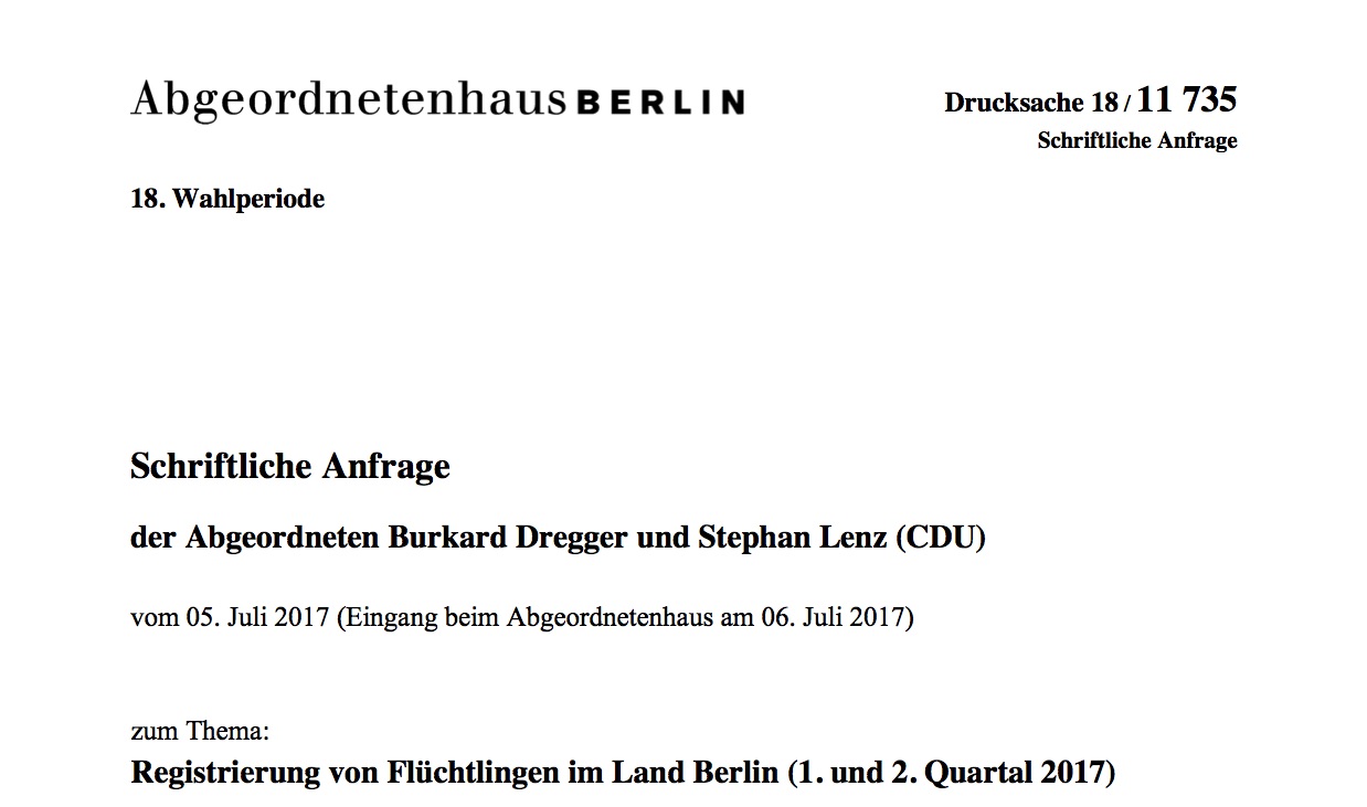 Wie viele Flüchtlinge in der ersten Jahreshälfte 2017 in Berlin im Landesamt für Flüchtlingsangelegenheiten registriert wurden und wie sich diese Zahlen zu denen aus 2014 bis 2016 verhalten, haben mein Kollege Burkard Dregger und ich in einer Anfrage herausfinden wollen.
