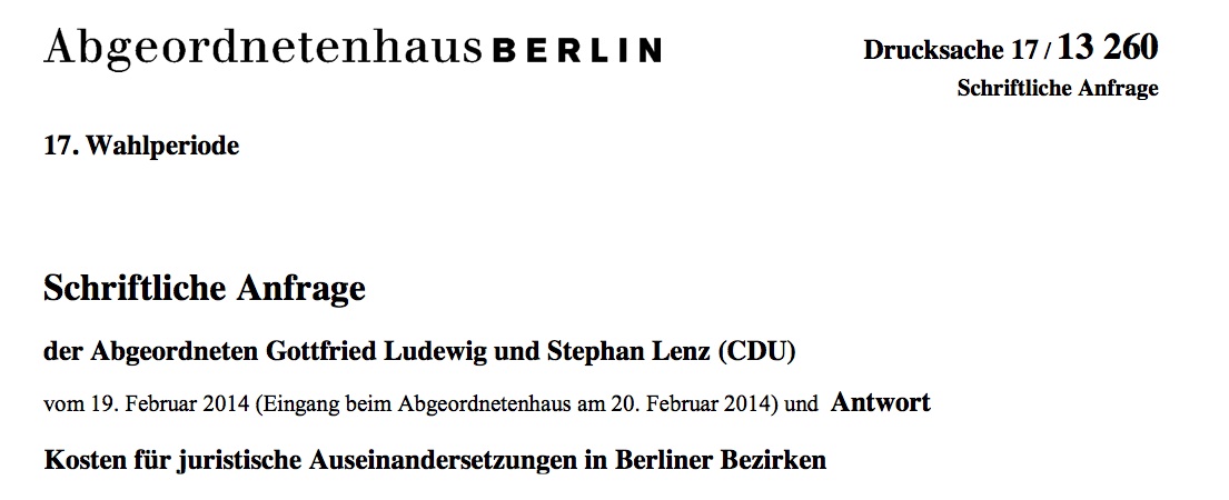 Gemeinsam mit meinem Pankower CDU-Kollegen Gottfried Ludewig habe ich beim Senat eine Aufstellung zu den Kosten juristischer Auseinandersetzungen in den Bezirken eingeholt.